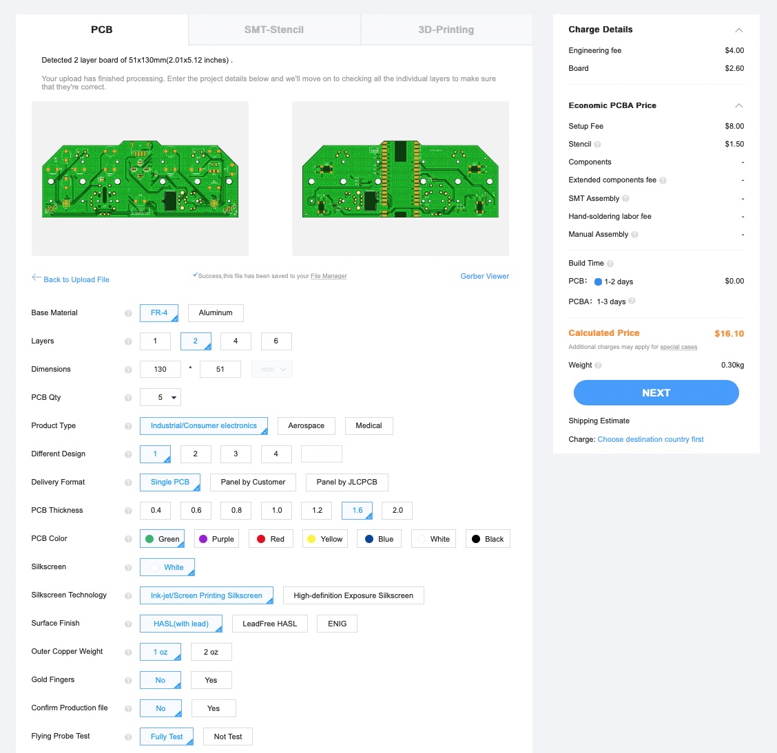 The minimum order in JLCPCB is 5 PCBs with 2 of them having front SMD components soldered on it. Which is a bit of a waste, but the 3 extra raw PCBs can be used to practice soldering if needed.
