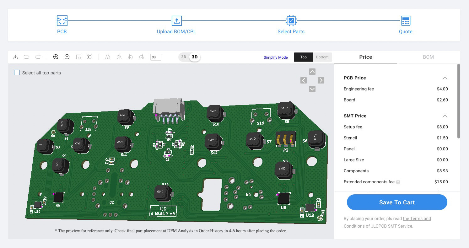 If you want to order a PCB from the bare schematics, we recommend using a PCB prototyping service such as JLCPCB, which manufacture cheap PCBs in low quantities, with the option to solder a good assortment of SMD (Surface Mount Devices) onto the board. Though is possible to use any other service of your preference.