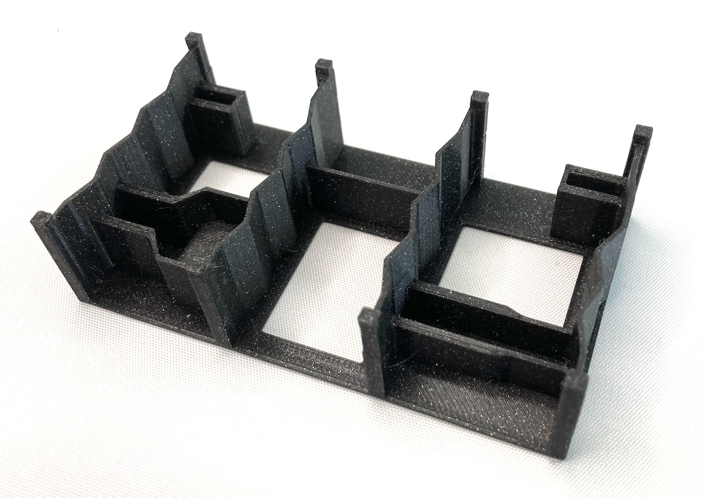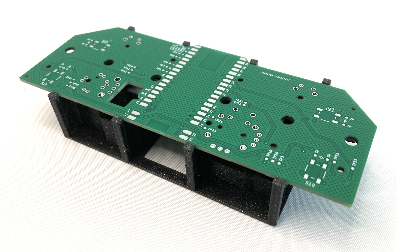To make the soldering easier is possible to 3D-print a PCB stand, which allows to place the PCB upside-down, keeps the PCB flat, and the through-hole components in their correct positions.