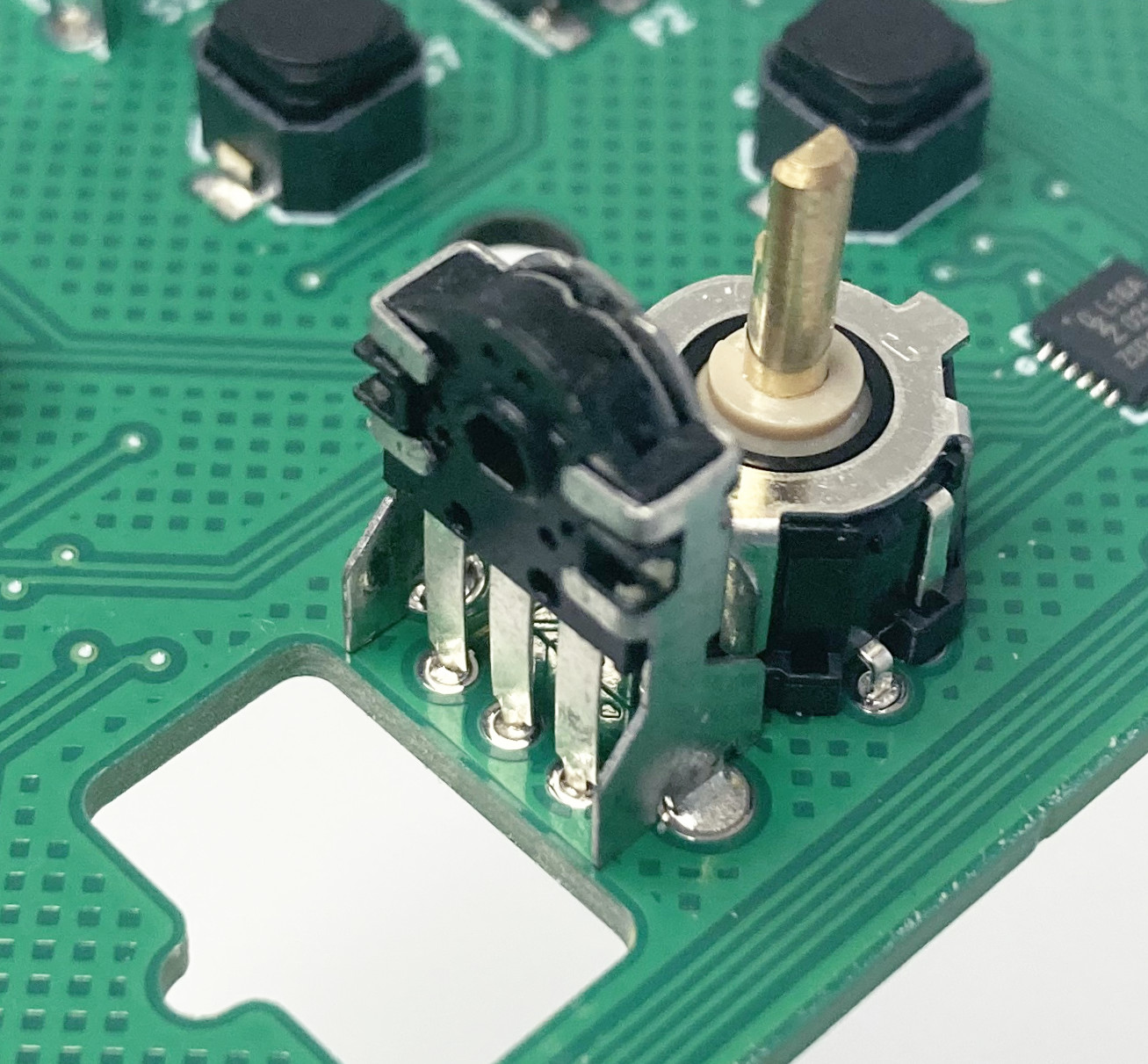 The Alps Alpine RKJXV122400R is held in place to be soldered thanks to the PCB stand. Be sure that the part is flat and there are no gaps before soldering all the pins.