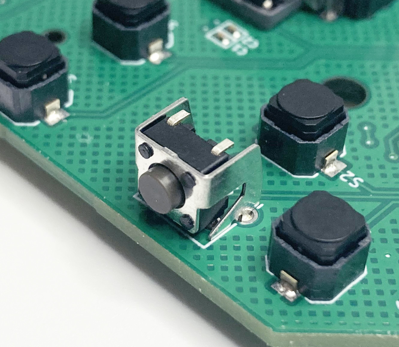 A total of 4 Alps Alpine SKQGAFE010 have to be soldered on the back of the PCB, these are SMD devices, but have long legs easy to solder with a normal soldering iron, and can be held in place with a piece of tape.