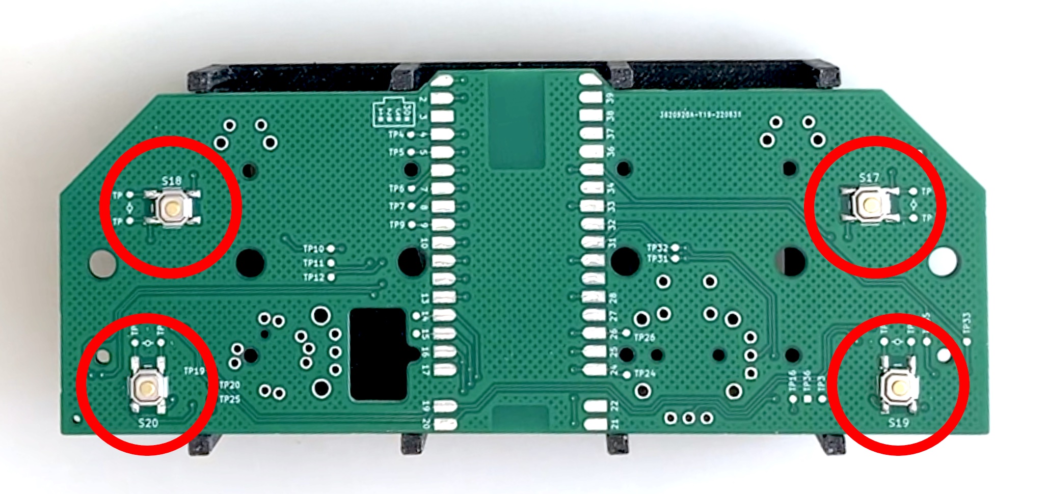 - Check continuity test points (TP) with the multimeter (while clicking the button).