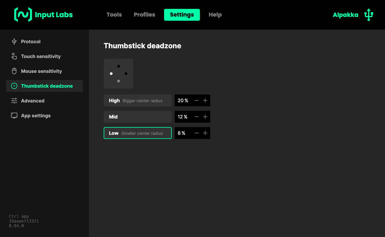 Thumbstick deadzone Hold Home + hold Hat left | ![]() Low 8% (Default) | ![]() Mid 12% | ![]() High 20% |